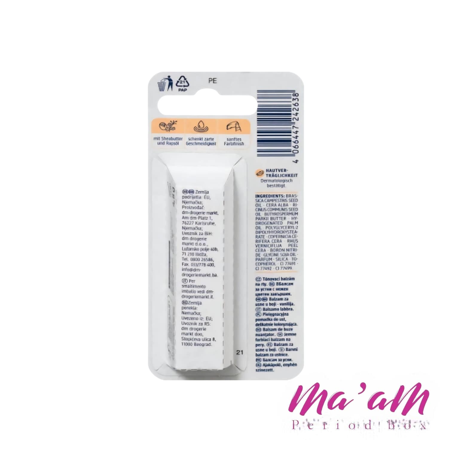 3️⃣ این بالم لب فاقد پارافین و روغنهای معدنی (Mineralöle) بوده و برای کودکان و پوستهای حساس کاملاً ایمن است. 👶