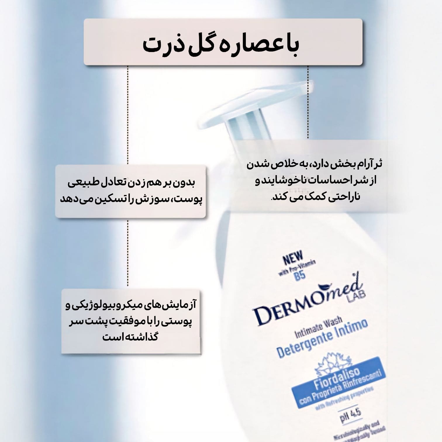 این محصول تحت آزمایشهای دقیق درماتولوژیکی قرار گرفته است. Dermomed Cornflower Intimate Wash هیچگونه ترکیب مضر مانند پارابن، الکل یا رنگ مصنوعی ندارد، و برای پوستهای حساس، حتی در دوران قاعدگی یا بارداری نیز کاملاً مناسب است.